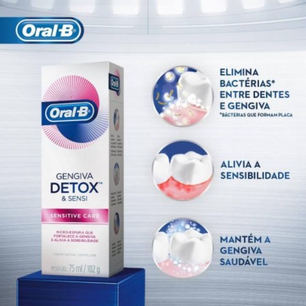 O Creme Dental com Flúor Detox Sensitive Care Oral-B é indicado para gengivas sensíveis. Seus ingredientes aliviam a sensibilidade bucal e limpam profundamente entre dentes e gengiva.
